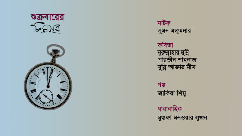 নাটক বন্ধ ঘড়ি ॥ সুমন মজুমদার ধারাবাহিক খলিশাপুরের কুকুরগুলো এবং রকিবের থিসিস-২১॥ মুস্তফা মনওয়ার সুজন ছোটগল্প বিমর্ষ দিন ॥ জাকিয়া শিমু কবিতা কথার ঘূর্ণিপাকে ॥ পারভীন শাহনাজ ঠোঁট ও উদ্ভ্রান্ত বিকেল ॥ নুরুন্নাহার মুন্নি যাযাবর বচন ॥ মুন্নি আক্তার মীম মন্তব্য